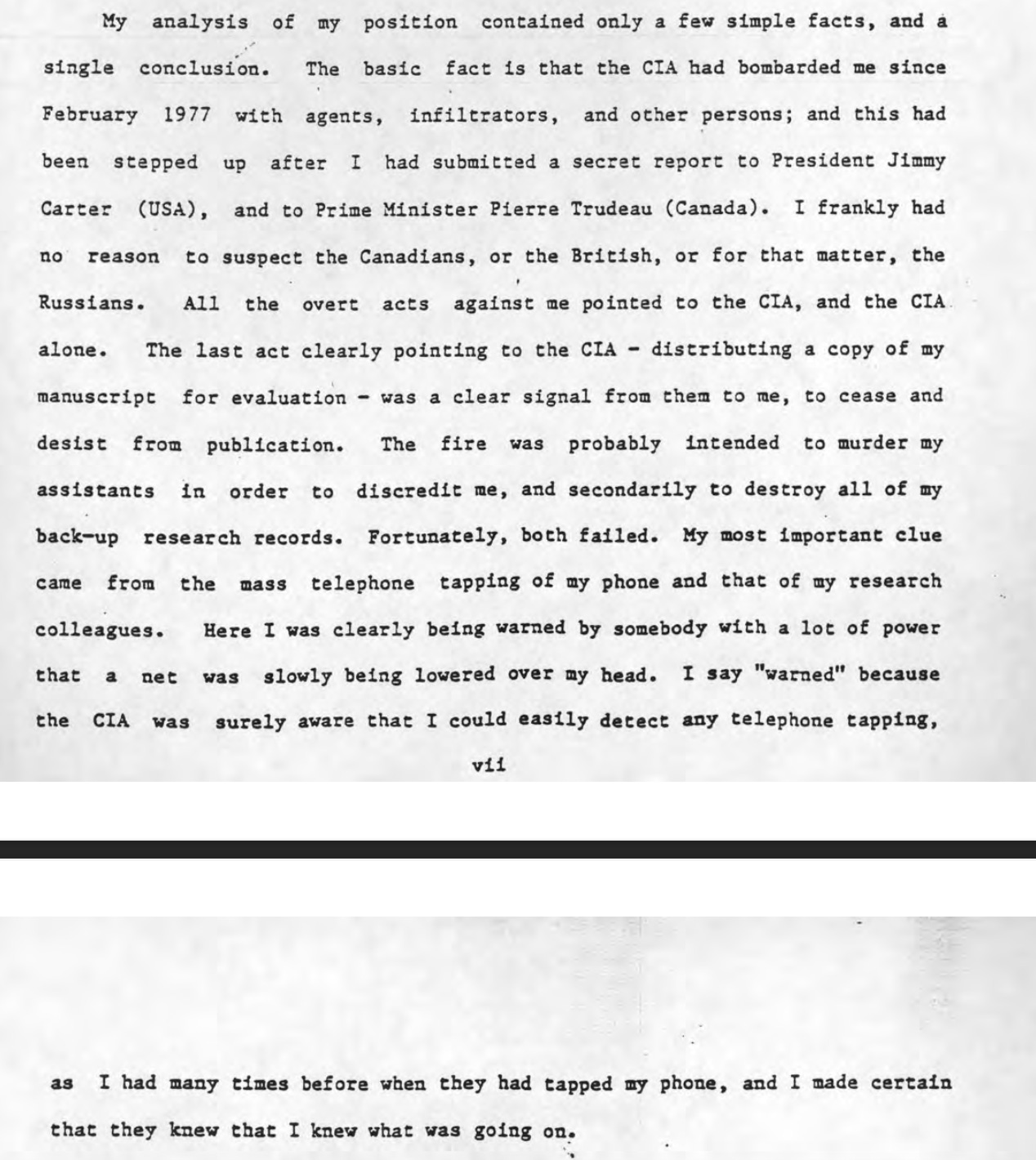 The doctor was terrified by what he had witnessed, and prepared a scientific briefing document on their findings which he carried by hand to President Jimmy Carter, Margaret Thatcher, and Pierre Trudeau. After his death, his ex-wife found a letter among his papers. Written by a Canadian senator and addressed to Trudeau, it reads: